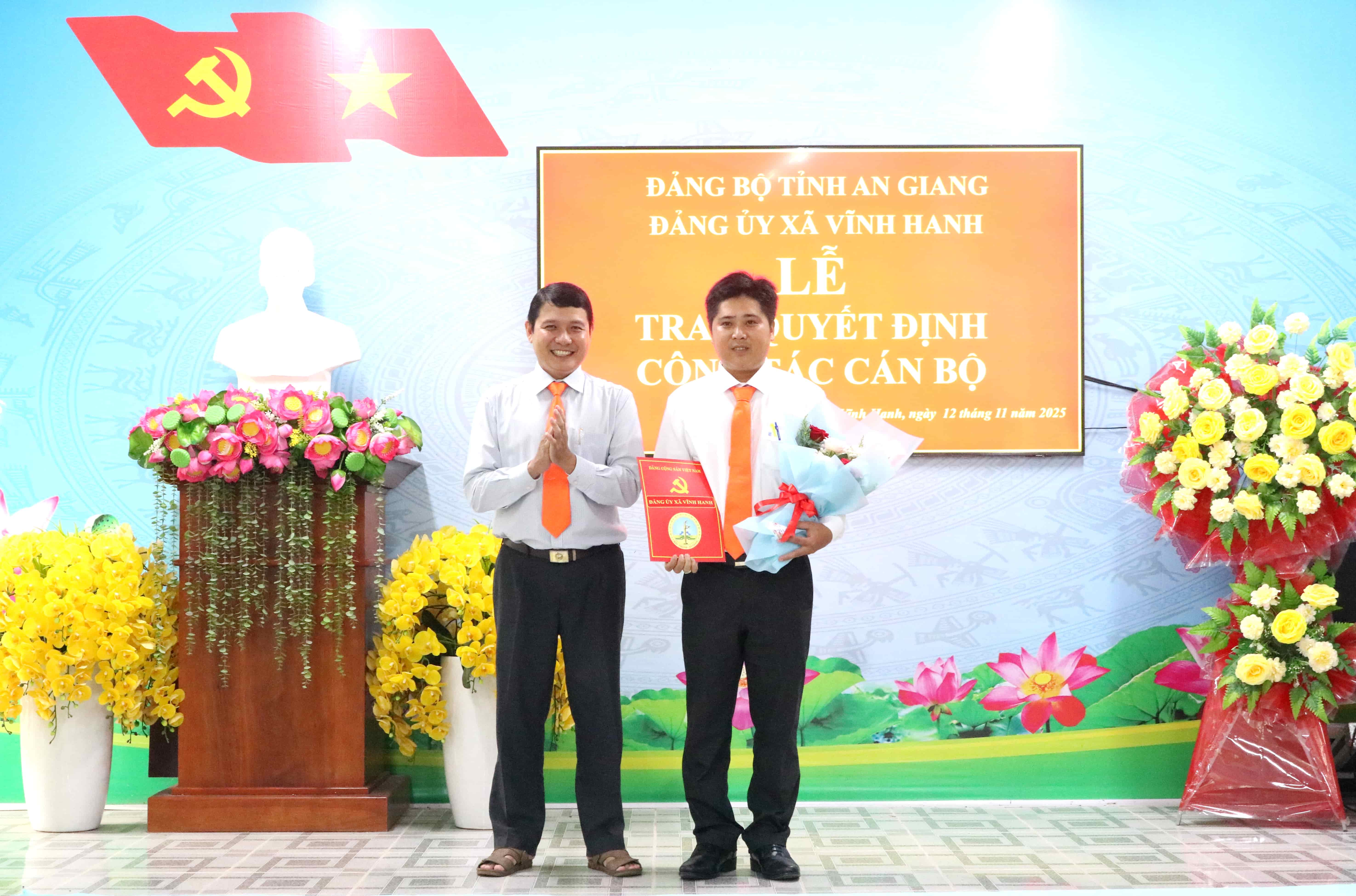 Đồng chí Hồ Trường Huấn – Bí thư Đảng ủy, Chủ tịch HĐND xã Vĩnh Hanh trao Quyết định và hoa chúc mừng đồng chí Nguyễn Thanh Nhiều.