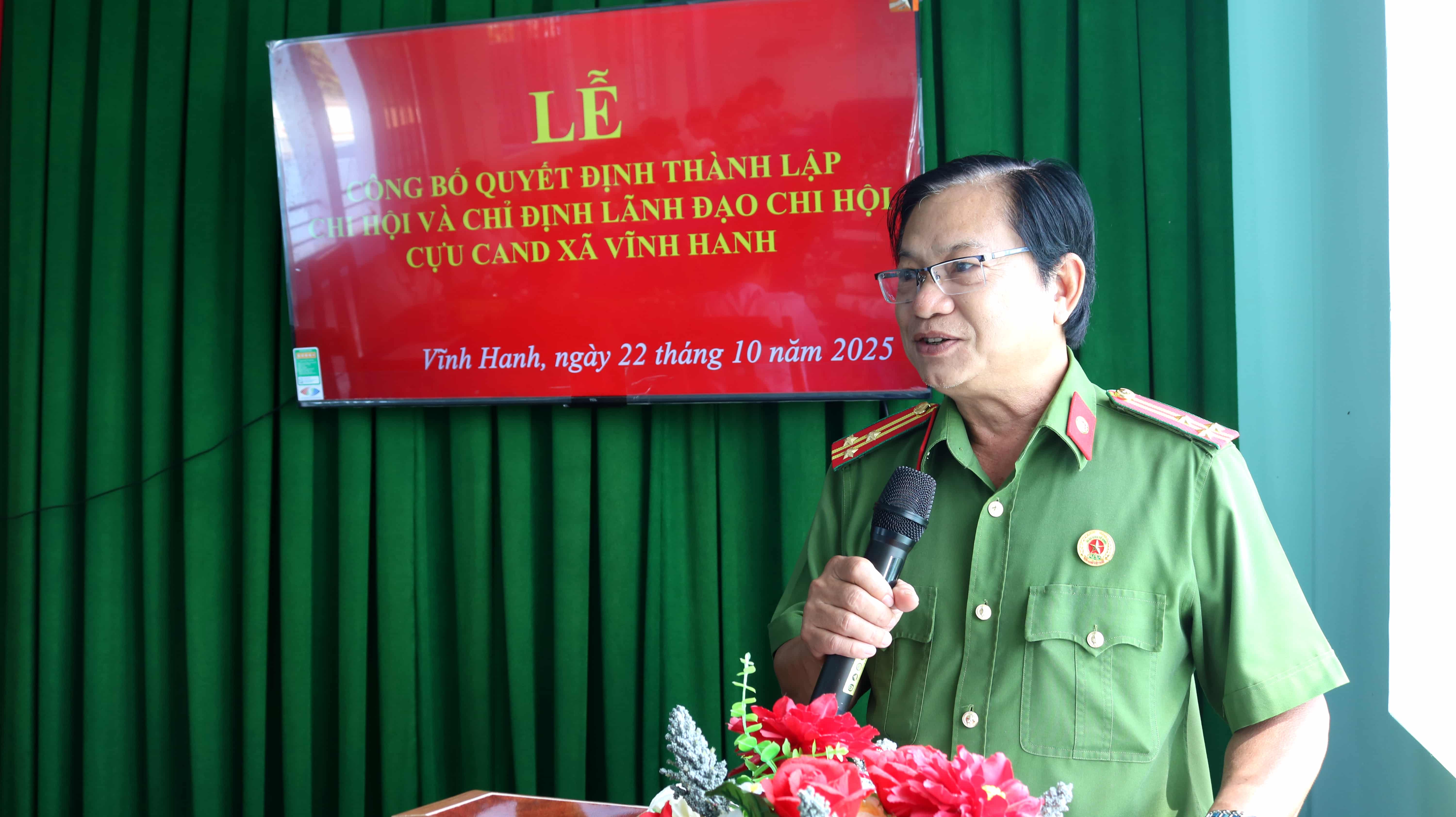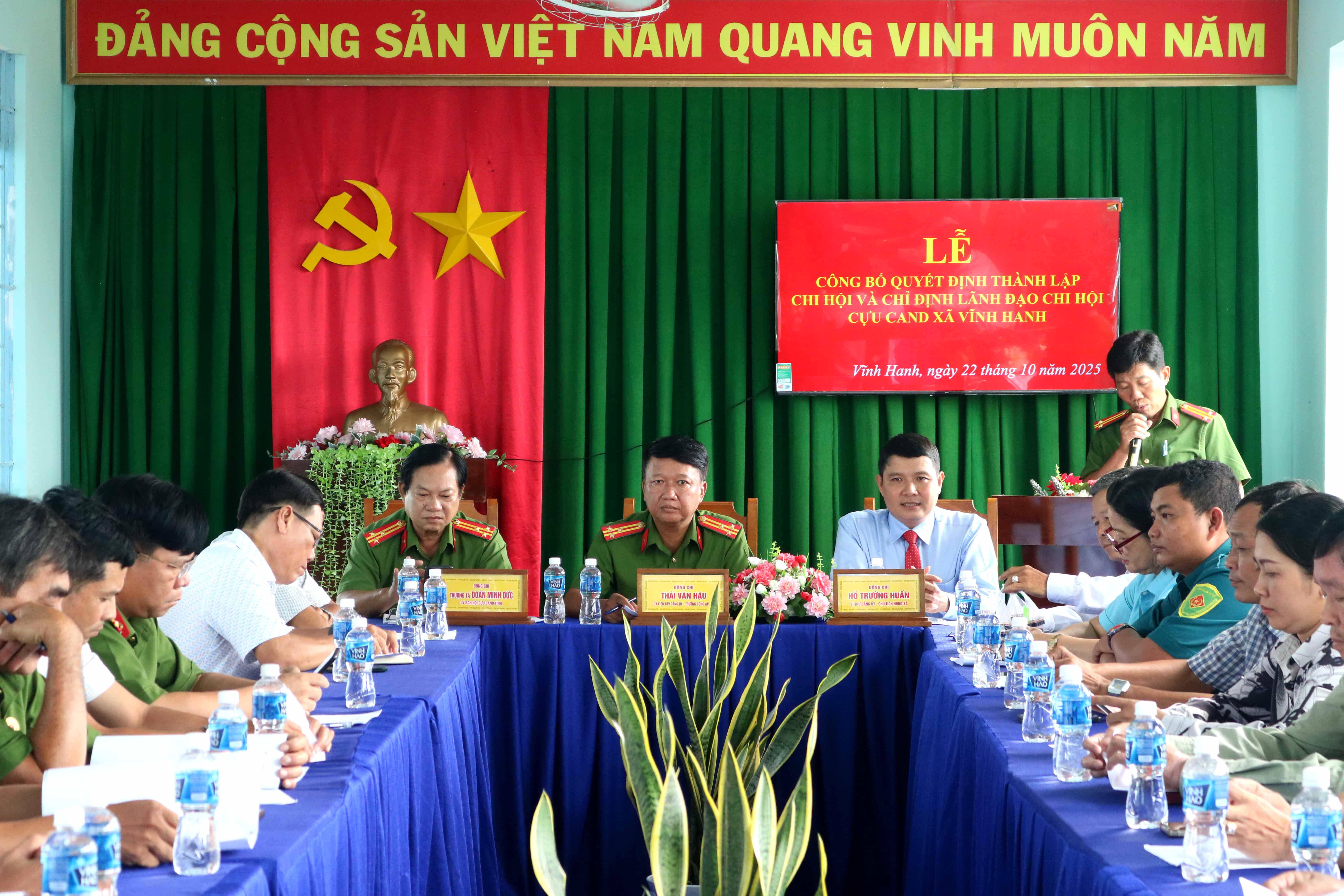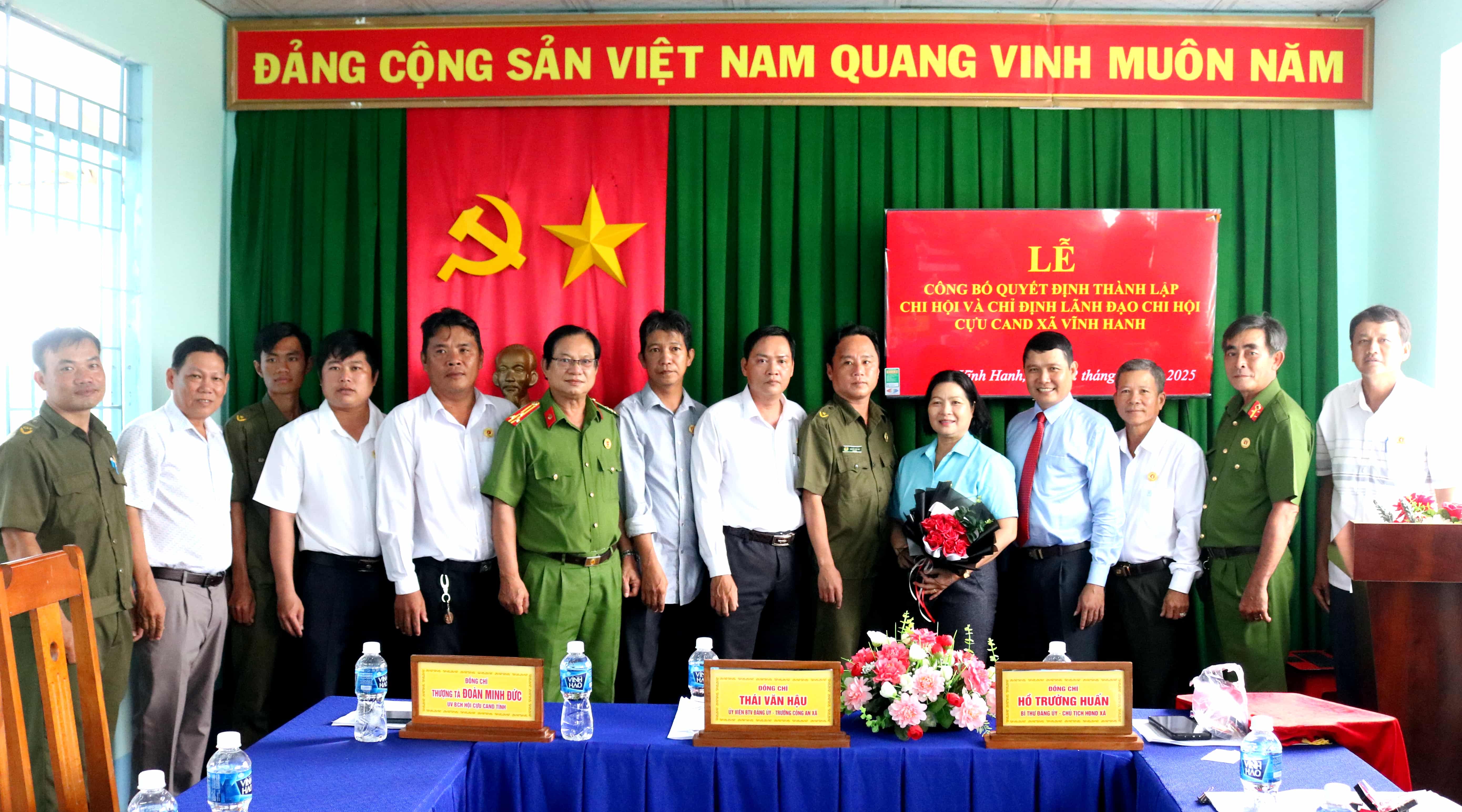 Đồng thời, công bố và trao Quyết định thành lập Chi hội Cựu Công an nhân dân xã Vĩnh Hanh và chỉ định lãnh đạo Chi hội Cựu Công an nhân dân xã Vĩnh Hanh. Theo đó, Chi hội Cựu Công an nhân dân xã Vĩnh Hanh gồm 16 đồng chí. Đồng chí Đồng Văn Phao được chỉ định Chi hội trưởng Chi hội Cựu Công an nhân dân xã Vĩnh Hanh. Các đồng chí Nguyễn Quốc Tuấn và Ngô Minh Nhựt được chỉ định Chi hội phó Chi hội Cựu Công an nhân dân xã Vĩnh Hanh.