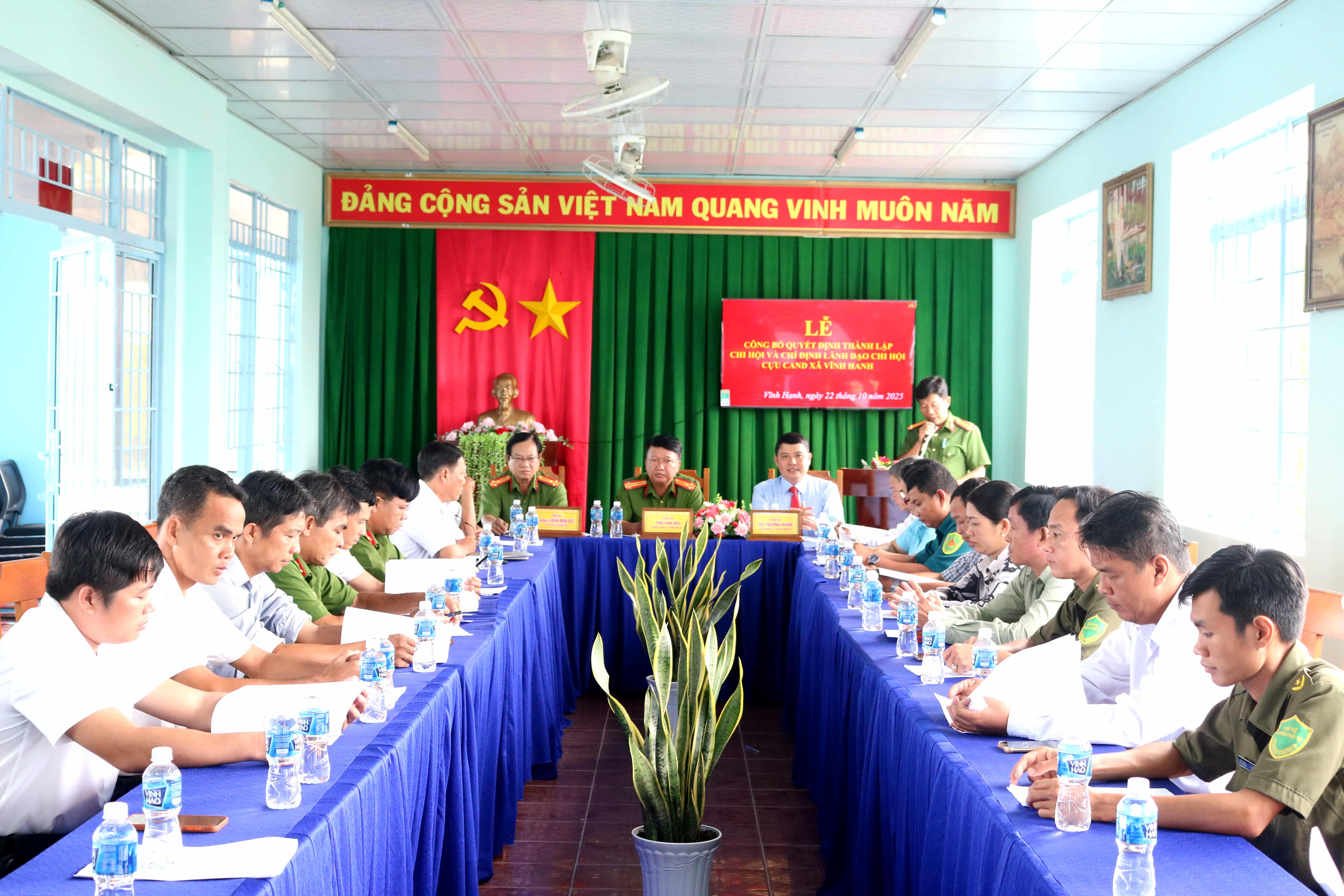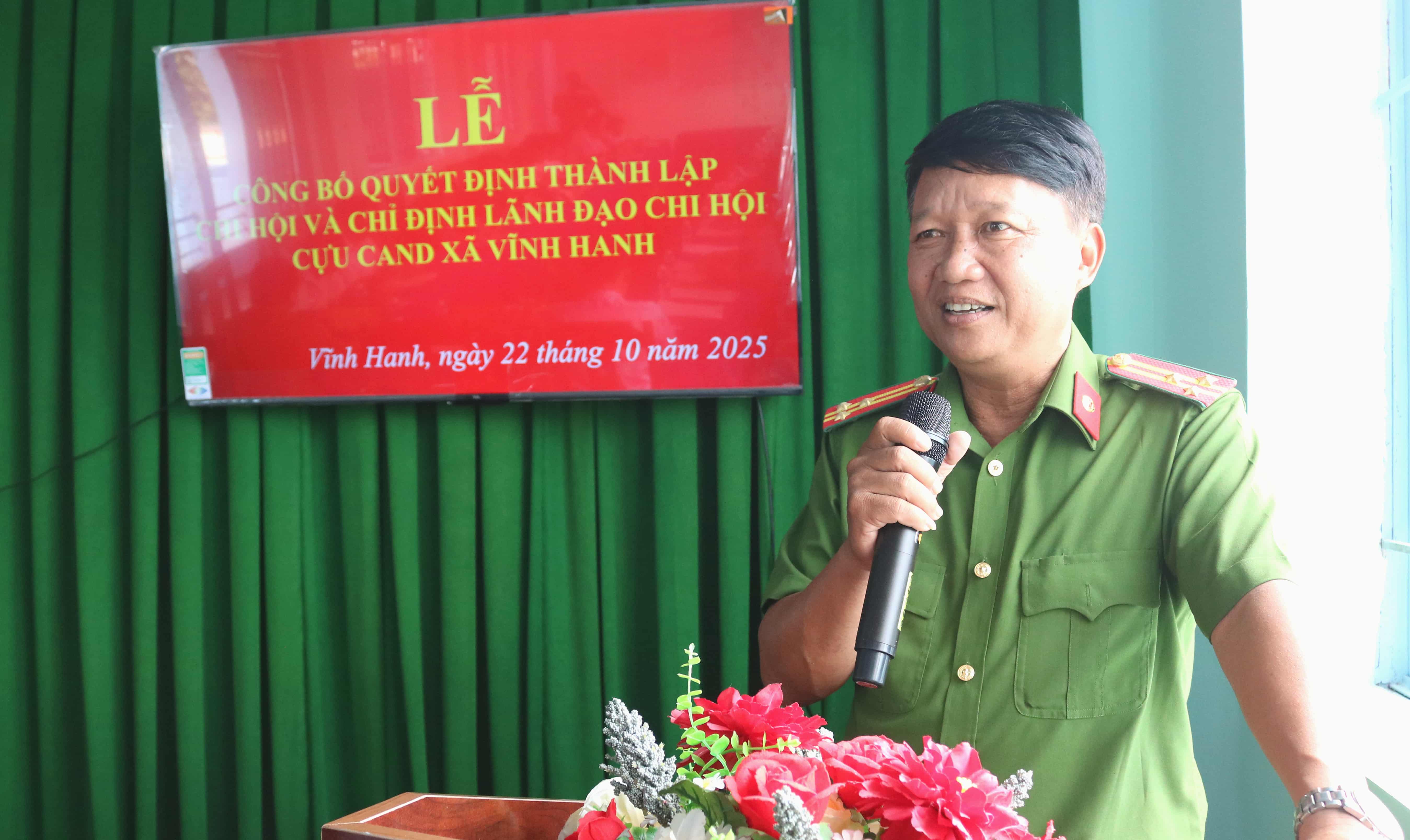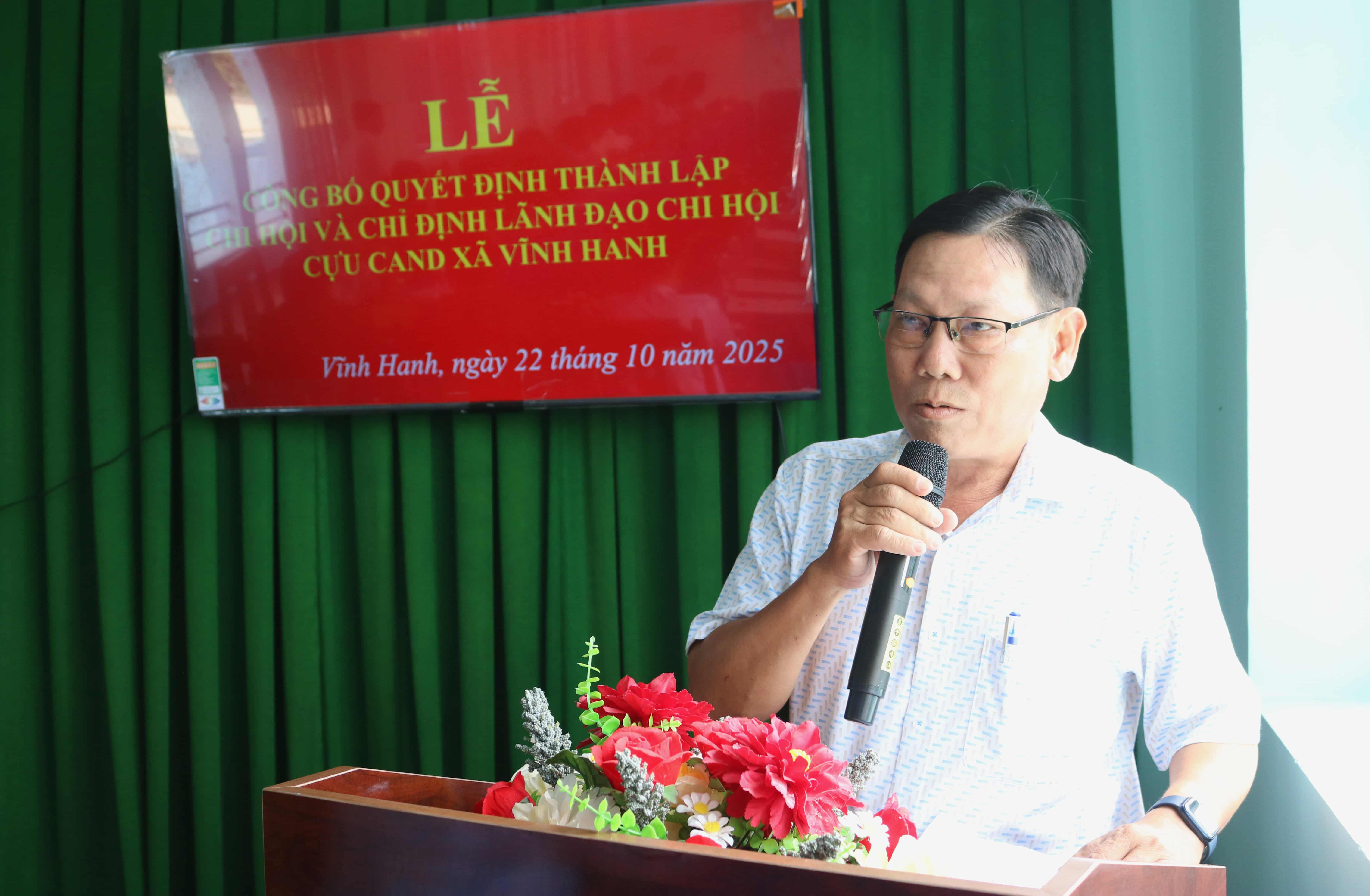 Đồng thời, công bố và trao Quyết định thành lập Chi hội Cựu Công an nhân dân xã Vĩnh Hanh và chỉ định lãnh đạo Chi hội Cựu Công an nhân dân xã Vĩnh Hanh. Theo đó, Chi hội Cựu Công an nhân dân xã Vĩnh Hanh gồm 16 đồng chí. Đồng chí Đồng Văn Phao được chỉ định Chi hội trưởng Chi hội Cựu Công an nhân dân xã Vĩnh Hanh. Các đồng chí Nguyễn Quốc Tuấn và Ngô Minh Nhựt được chỉ định Chi hội phó Chi hội Cựu Công an nhân dân xã Vĩnh Hanh.