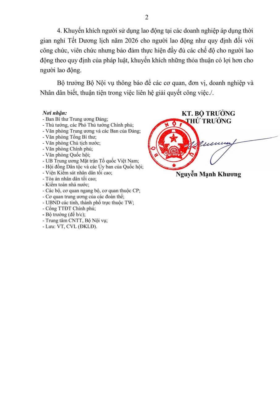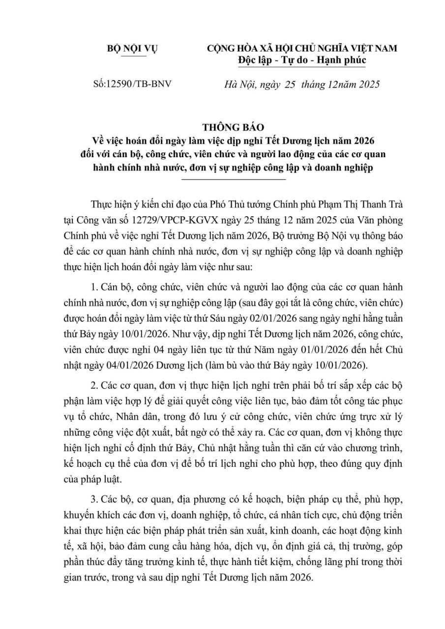 Thông báo về việc hoán đổi ngày làm việc dịp nghĩ Tết Dương lịch năm 2026 đối với cán bộ, công chức, viên chức và người lao động của các cơ quan hành chính nhà nước, đơn vị sự nghiệp công lập và doanh nghiệp
