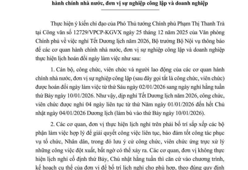 Thông báo về việc hoán đổi ngày làm việc dịp nghĩ Tết Dương lịch năm 2026 đối với cán bộ, công chức, viên chức và người lao động của các cơ quan hành chính nhà nước, đơn vị sự nghiệp công lập và doanh nghiệp