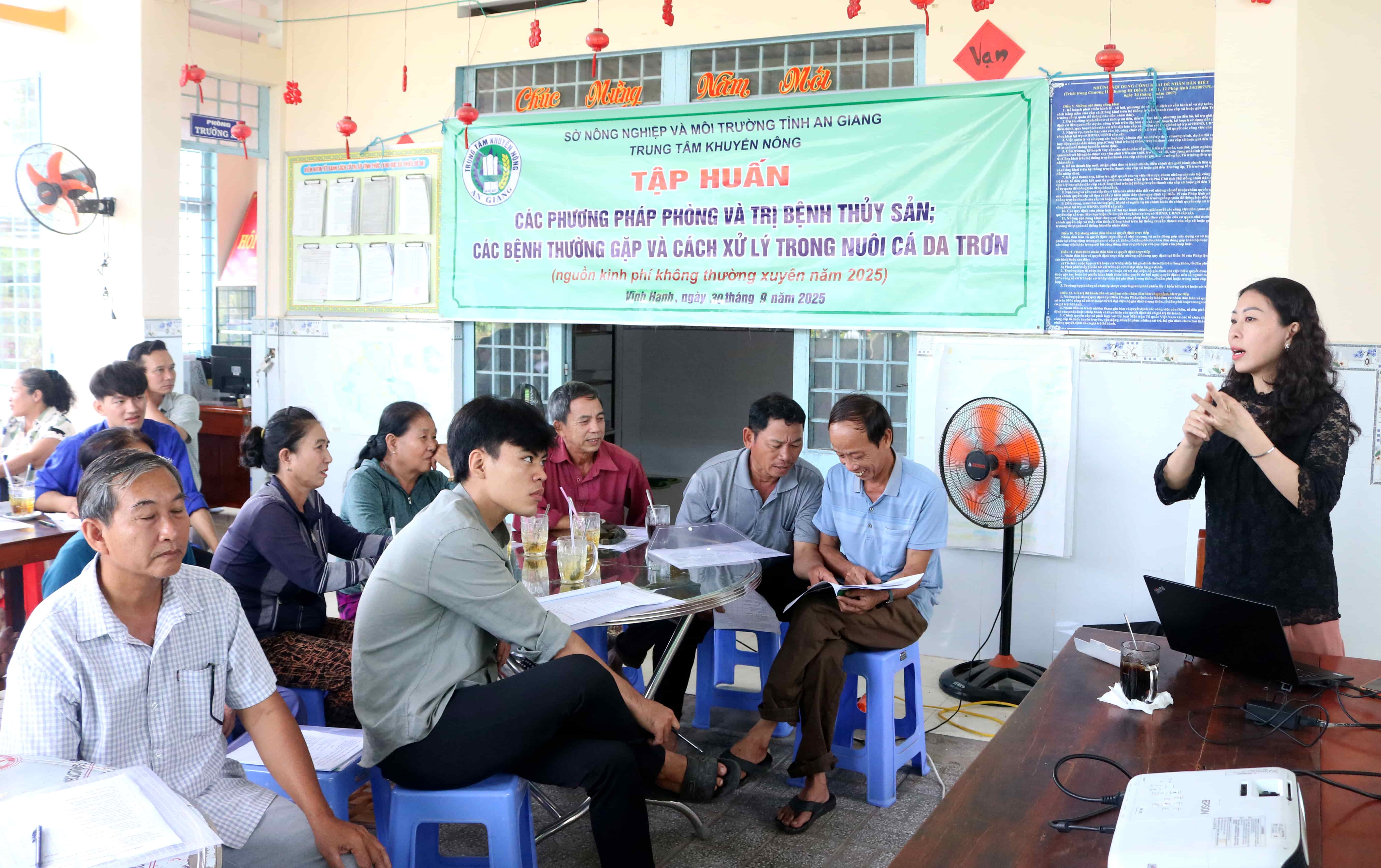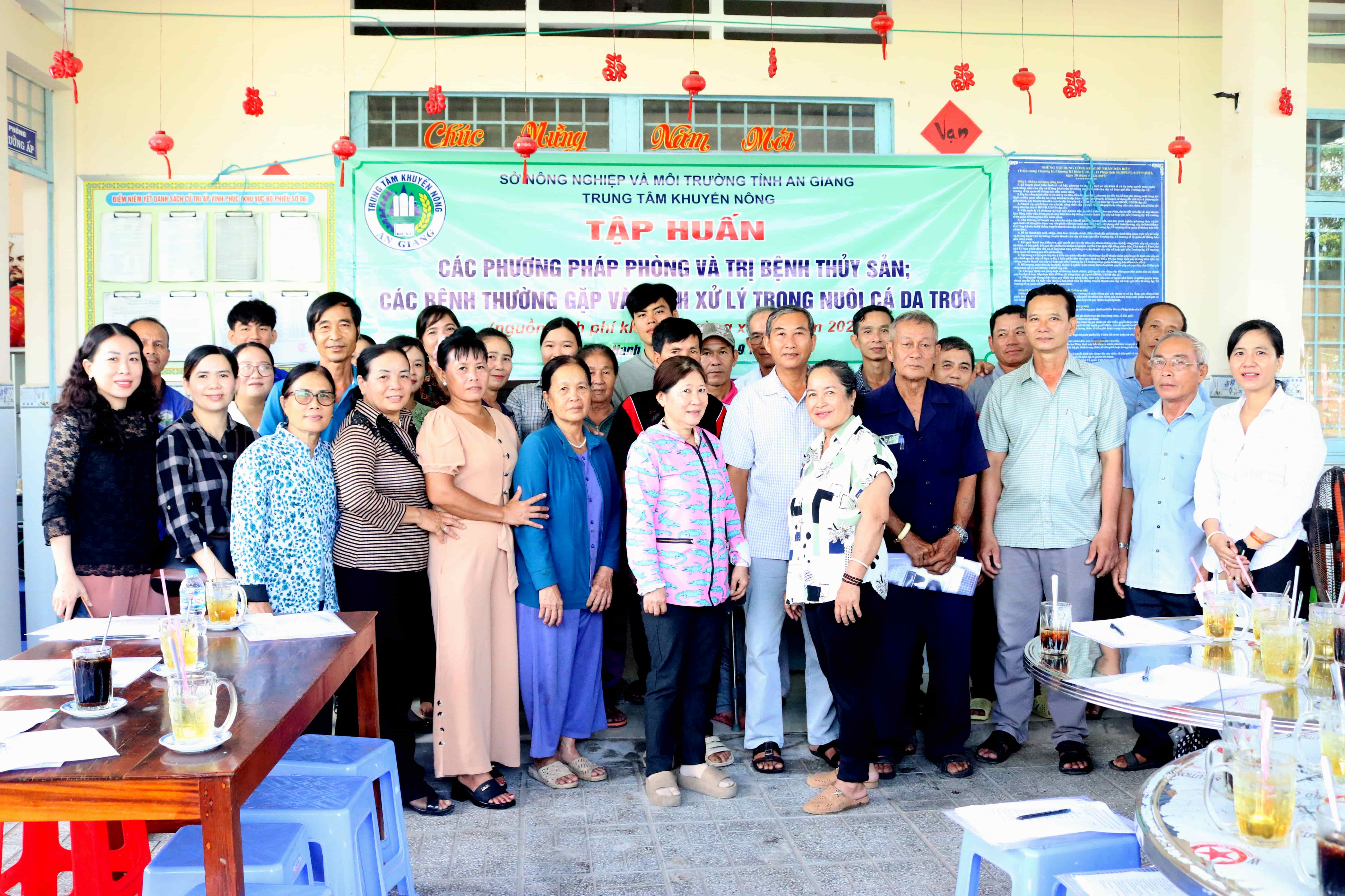 Tại lớp tập huấn, các nông dân được bà Nguyễn Tường Khanh - Viên chức Phòng Khuyến ngư, Trung tâm Khuyến nông tỉnh An Giang hướng dẫn các phương pháp phòng và trị bệnh thủy sản. Trong đó, bà Nguyễn Tường Khanh tập trung hướng dẫn nông dân nhận biết các bệnh thường gặp và cách xử lý trong nuôi cá da trơn bao gồm: nguyên nhân gây bệnh, các biện pháp phòng và trị bệnh, những kinh nghiệm trong thực tế nuôi cá da trơn.
