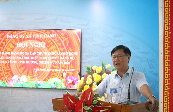 Ngày 11-12-2025, Đảng ủy xã Vĩnh Hanh tổ chức Hội nghị Ban Chấp hành Đảng bộ xã lần thứ 03 (khóa I), nhiệm kỳ 2025-2030 (mở rộng), nhằm tổng kết tình hình thực hiện Nghị quyết Đảng bộ xã năm 2025, phương hướng, nhiệm vụ năm 2026 và cho ý kiến một số nội dung quan trọng khác. Dự và chỉ đạo Hội nghị có đồng chí Ngô Văn Vạn - Ủy viên Ủy ban Kiểm tra Tỉnh ủy An Giang. Chủ trì Hội nghị đồng chí Hồ Trường Huấn - Bí thư Đảng ủy, Chủ tịch HĐND xã; đồng chí Ngô Khắc Huy - Phó Bí thư Thường trực Đảng ủy; đồng chí Đoàn Đức Dịnh - Phó Bí thư Đảng ủy, Chủ tịch UBND xã. Tham dự Hội nghị còn có các đồng chí: Ủy viên Ban Thường vụ, Ủy viên Ban Chấp hành Đảng bộ xã (khóa I), lãnh đạo các cơ quan chuyên trách tham mưu, giúp việc Đảng ủy, Bí thư các tổ chức cơ sở đảng trực thuộc Đảng bộ xã, Lãnh đạo các phòng chuyên môn thuộc Ủy ban nhân dân xã, các Ban của Hội đồng nhân dân xã.