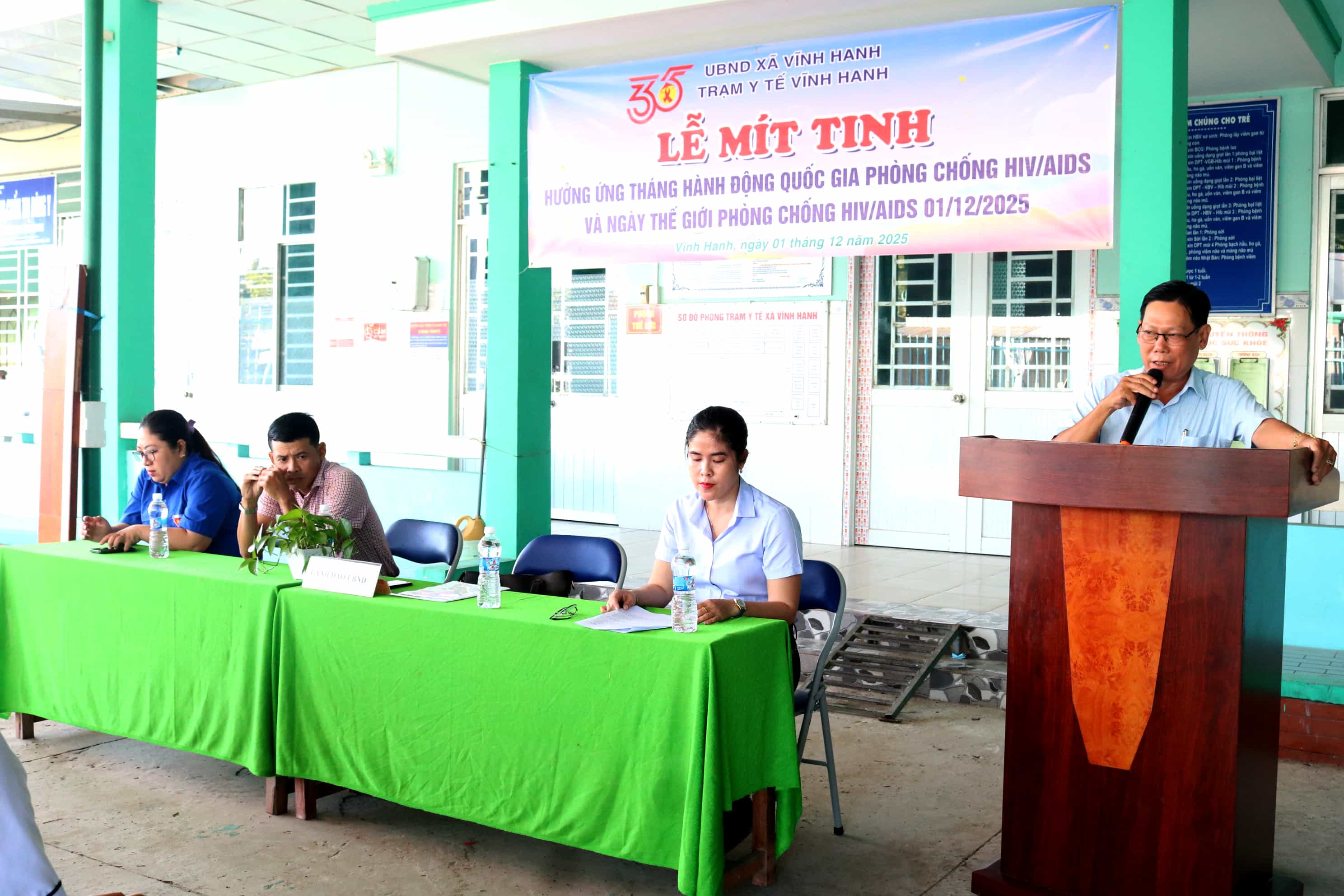Phát biểu tại buổi Lễ, ông Nguyễn Văn Tài – Phó Chủ tịch UBND xã Vĩnh Hanh thay mặt Ban Chỉ đạo xã kêu gọi và chỉ đạo nhiều nhiệm vụ trọng tâm trong thời gian tới. Cụ thể, địa phương tăng cường tuyên truyền, nâng cao nhận thức về phòng, chống HIV/AIDS trong mọi tầng lớp Nhân dân; Thúc đẩy xét nghiệm sớm, điều trị kịp thời, tạo điều kiện để người nhiễm HIV tiếp cận các dịch vụ y tế hiệu quả; Xóa bỏ kỳ thị, phân biệt đối xử, xây dựng môi trường thân thiện, giúp người nhiễm HIV hòa nhập cộng đồng và sống tích cực; Phát huy vai trò của từng cá nhân, tổ chức trong việc chung tay xây dựng xã hội lành mạnh, nói không với các hành vi nguy cơ cao.
