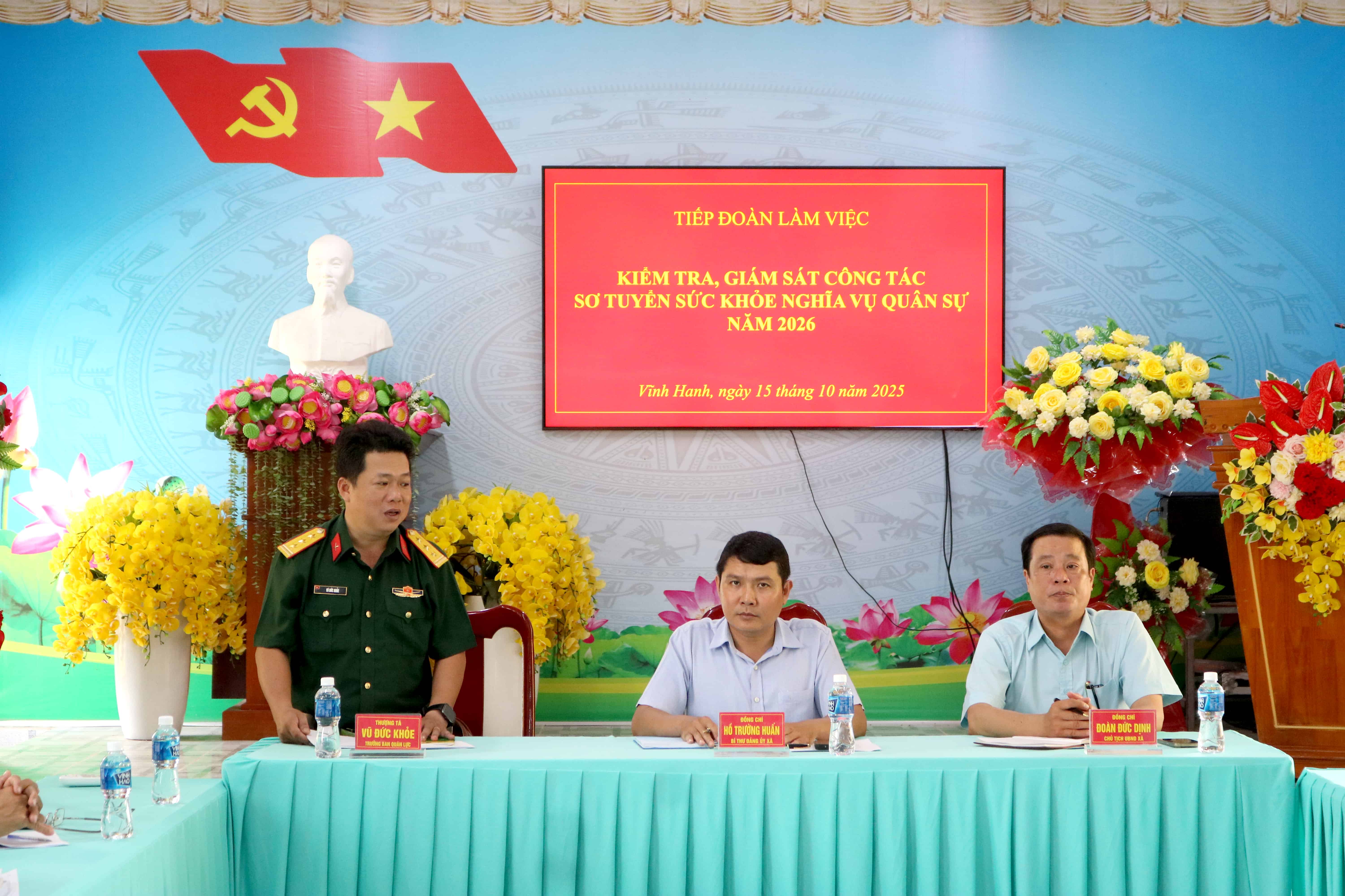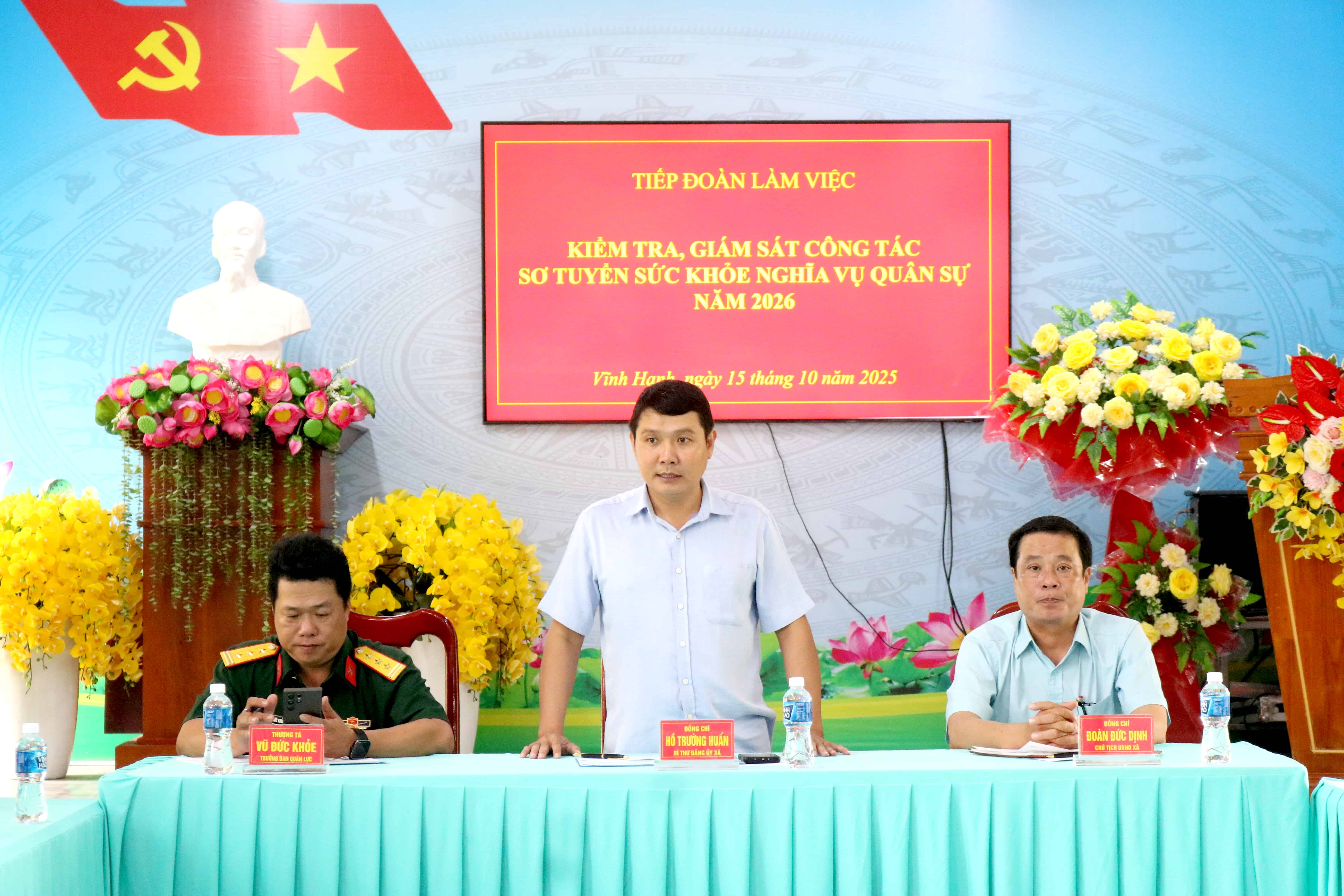 Phát biểu tại buổi kiểm tra, giám sát, đồng chí Hồ Trường Huấn – Bí thư Đảng ủy, Chủ tịch HĐND xã Vĩnh Hanh ghi nhận sự đóng góp của Đoàn kiểm tra về công tác khám sức khỏe ; Đồng thời, yêu cầu Hội đồng Nghĩa vụ Quân sự xã thực hiện tốt theo yêu cầu của Đoàn. Để thực hiện tốt công tác tuyển quân năm 2026, đồng chí Bí thư Đảng ủy xã Hồ Trường Huấn chỉ đạo Hội đồng Nghĩa vụ Quân sự xã phân công cụ thể, phối hợp nhịp nhàng trong thực hiện nhiệm vụ; Đẩy mạnh công tác tuyên truyền, vận động; Nâng cao chất lượng khám sức khỏe; Tăng cường tham mưu chắc, đảm bảo chỉ tiêu trên giao…