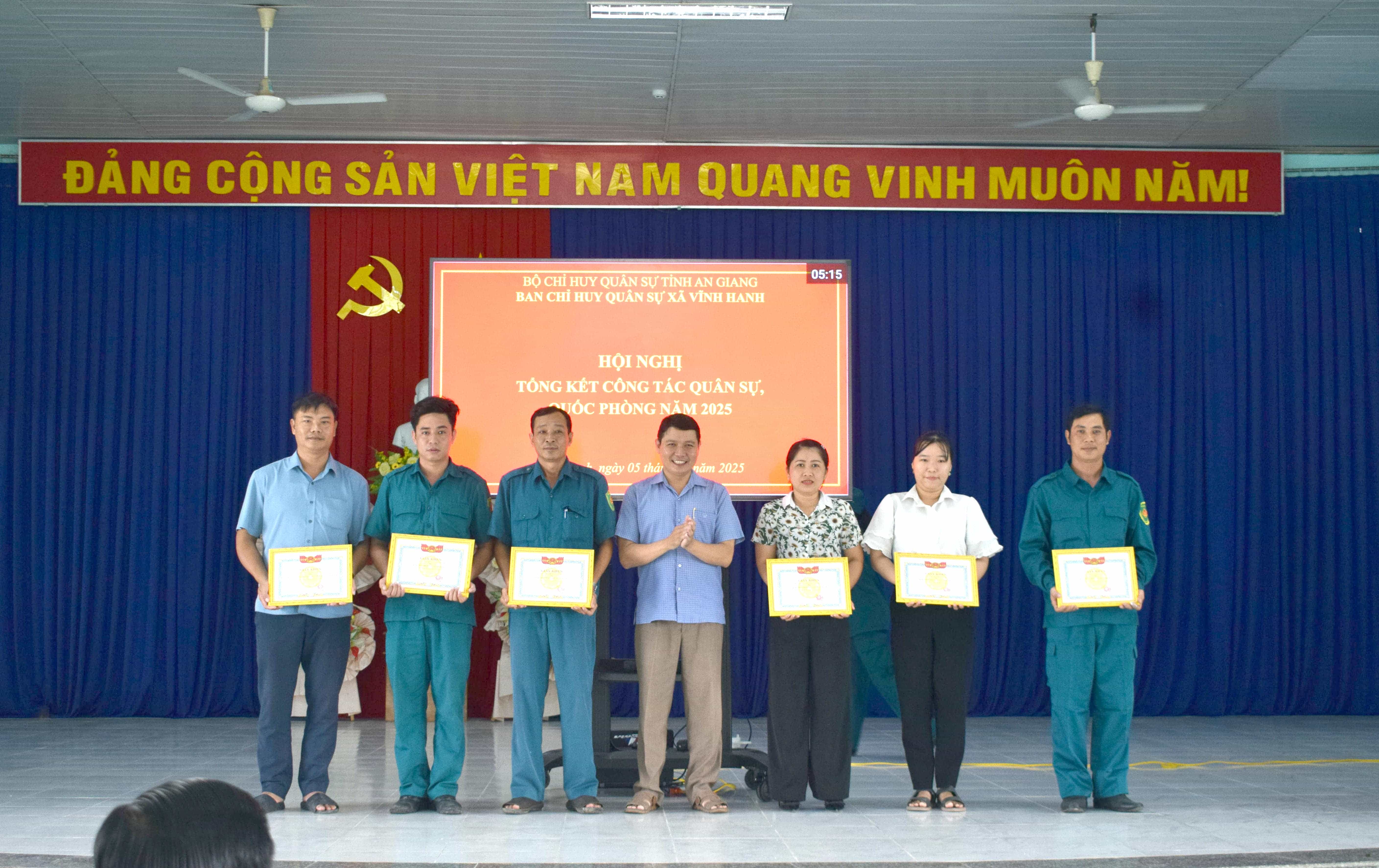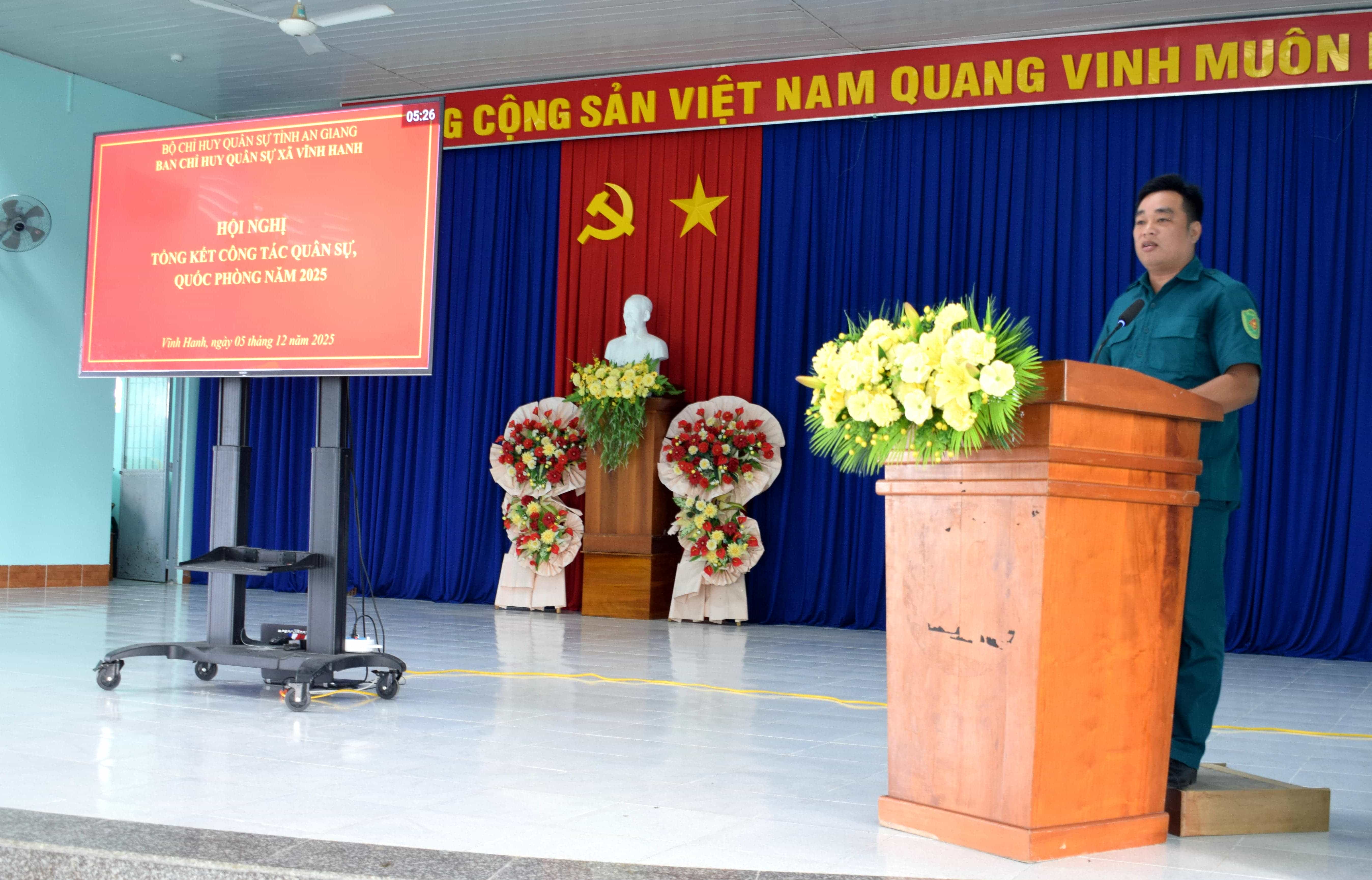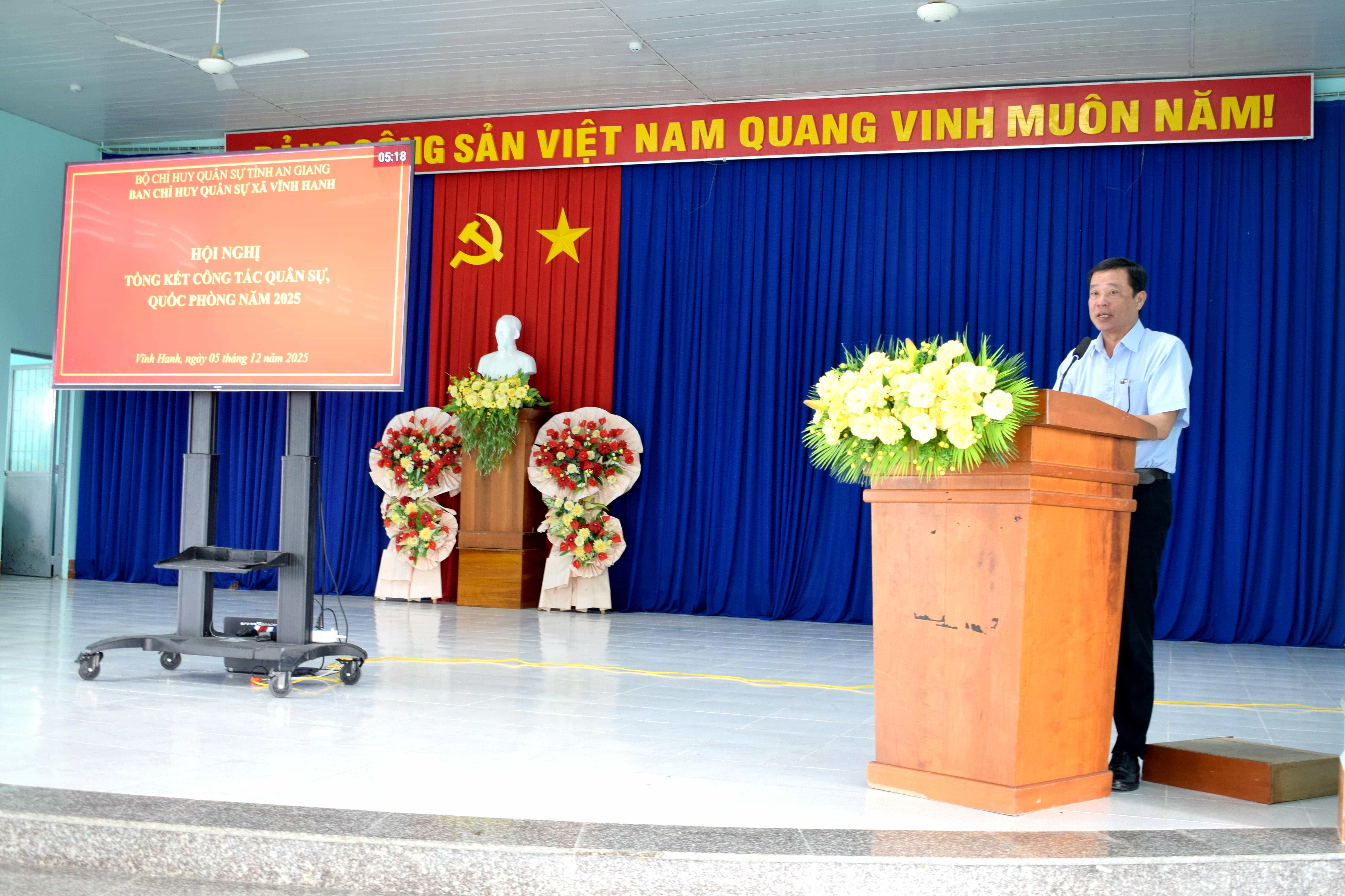 Ngày 05-12-2025, Ban Chỉ huy Quân sự xã Vĩnh Hanh tổ chức Hội nghị tổng kết công tác quân sự, quốc phòng địa phương năm 2025. Đồng chí Thiếu tá Ngô Thanh Quang – Chính trị viên Không thường trực, trợ lý công tác quần chúng, phòng chính trị, Ban Chỉ huy phòng thủ khu vực 2 – Long Xuyên; Đồng chí Hồ Trường Huấn – Bí thư Đảng ủy, Chủ tịch HĐND xã Vĩnh Hanh; Đồng chí Ngô Khắc Huy – Phó Bí thư Thường trực Đảng ủy xã Vĩnh Hanh; Đồng chí Đoàn Đức Dịnh – Phó Bí thư Đảng ủy, Chủ tịch UBND xã Vĩnh Hanh đã đến dự.