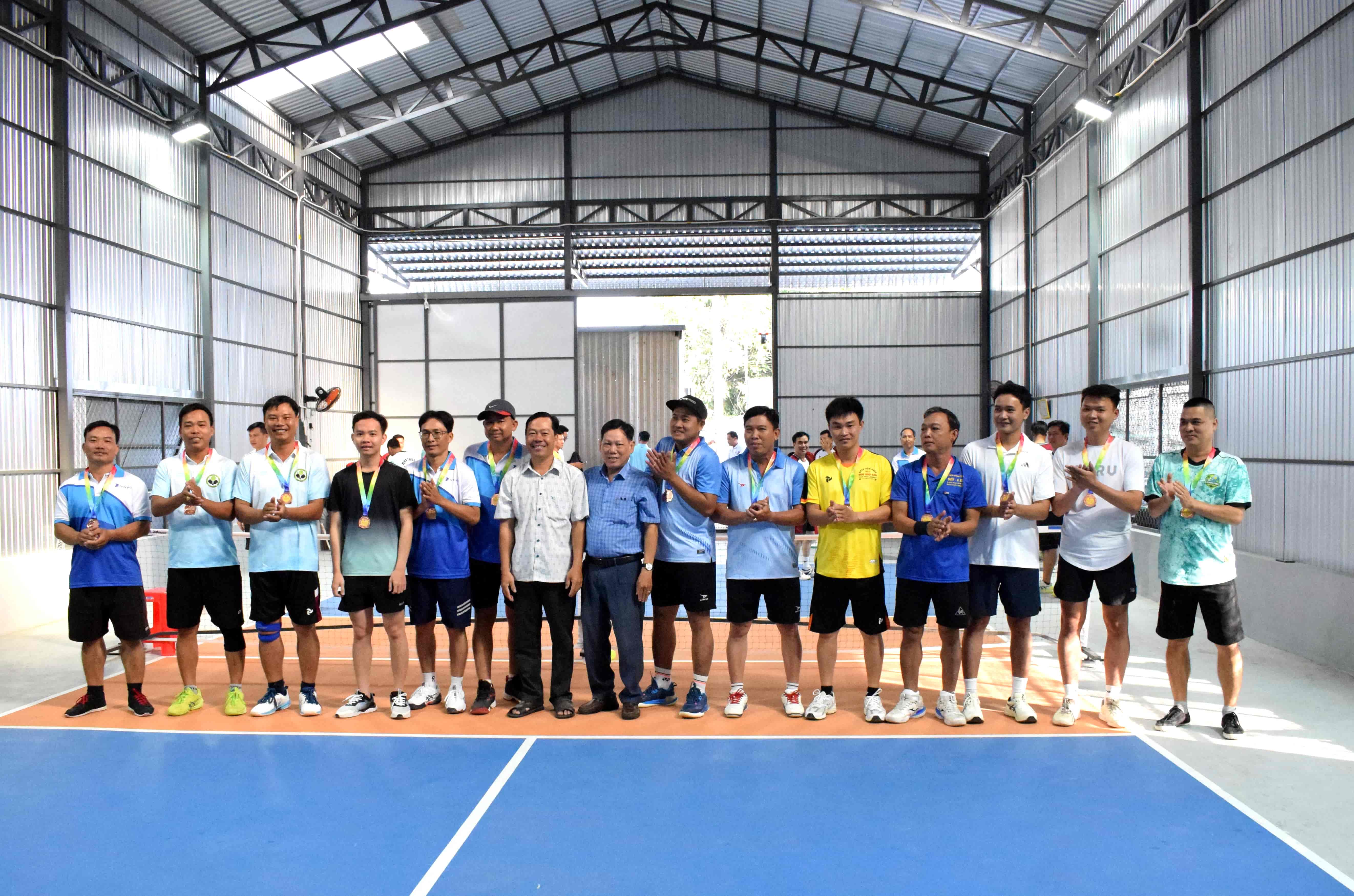 Lãnh đạo xã Vĩnh Hanh trao giải và cúp cho các đội có thành tích xuất sắc tại Giải Pickleball.