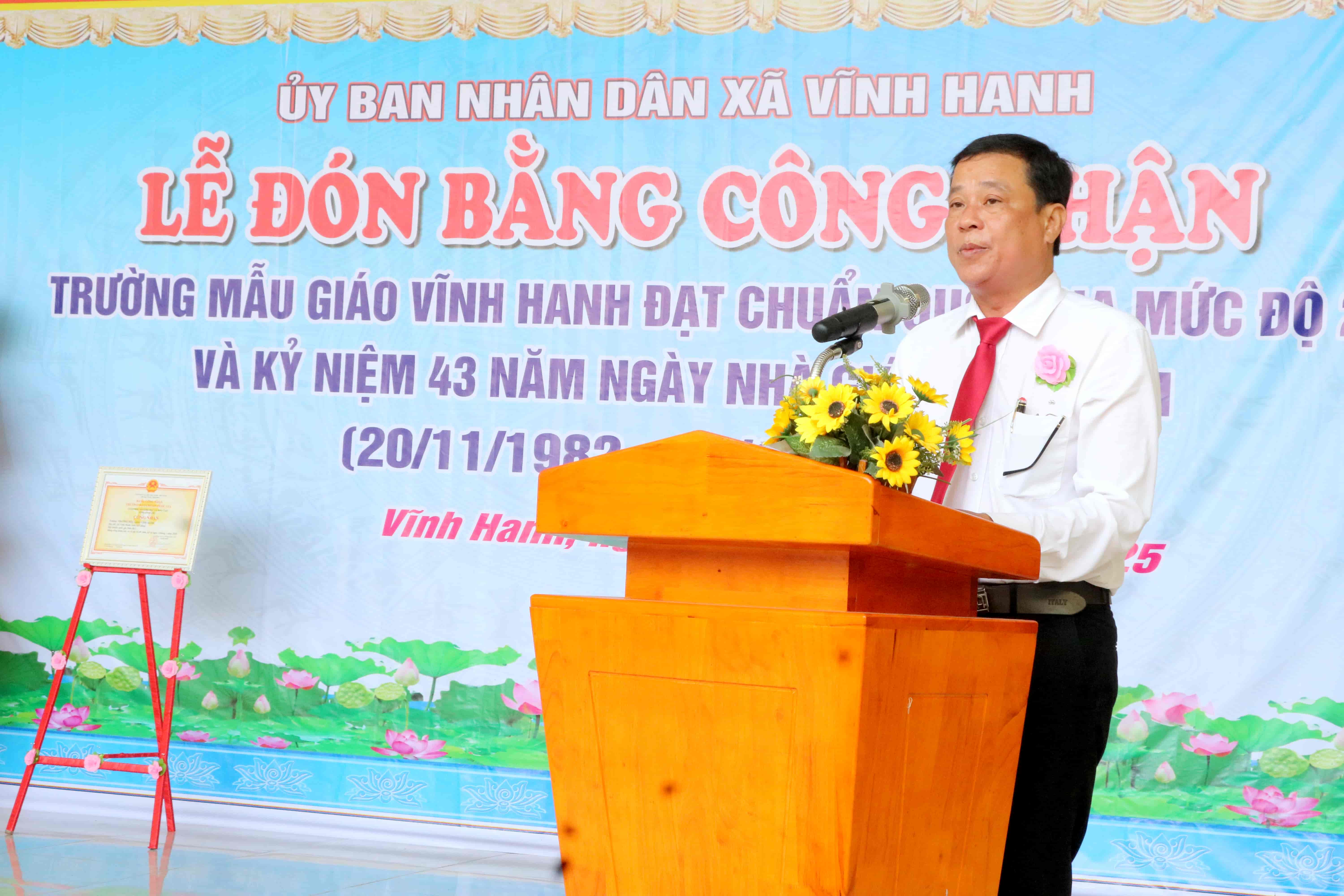 Phát biểu chỉ đạo tại buổi Lễ, đồng chí Đoàn Đức Dịnh – Phó Bí thư Đảng ủy, Chủ tịch UBND xã Vĩnh Hanh biểu dương, ghi nhận kết quả mà Trường Mẫu giáo Vĩnh Hanh đạt được. Qua đó, Chủ tịch UBND xã Vĩnh Hanh Đoàn Đức Dịnh yêu cầu trong thời gian tới, nhà trường tiếp tục nâng cao hiệu quả quản lý và tự đánh giá chất lượng; Phát triển cơ sở vật chất bền vững và hiện đại hóa; Tích cực bồi dưỡng nghiệp vụ và nâng cao đạo đức nhà giáo; Nâng cao chất lượng chăm sóc và giáo dục toàn diện; Huy động tốt nguồn lực từ cộng đồng xã hội.