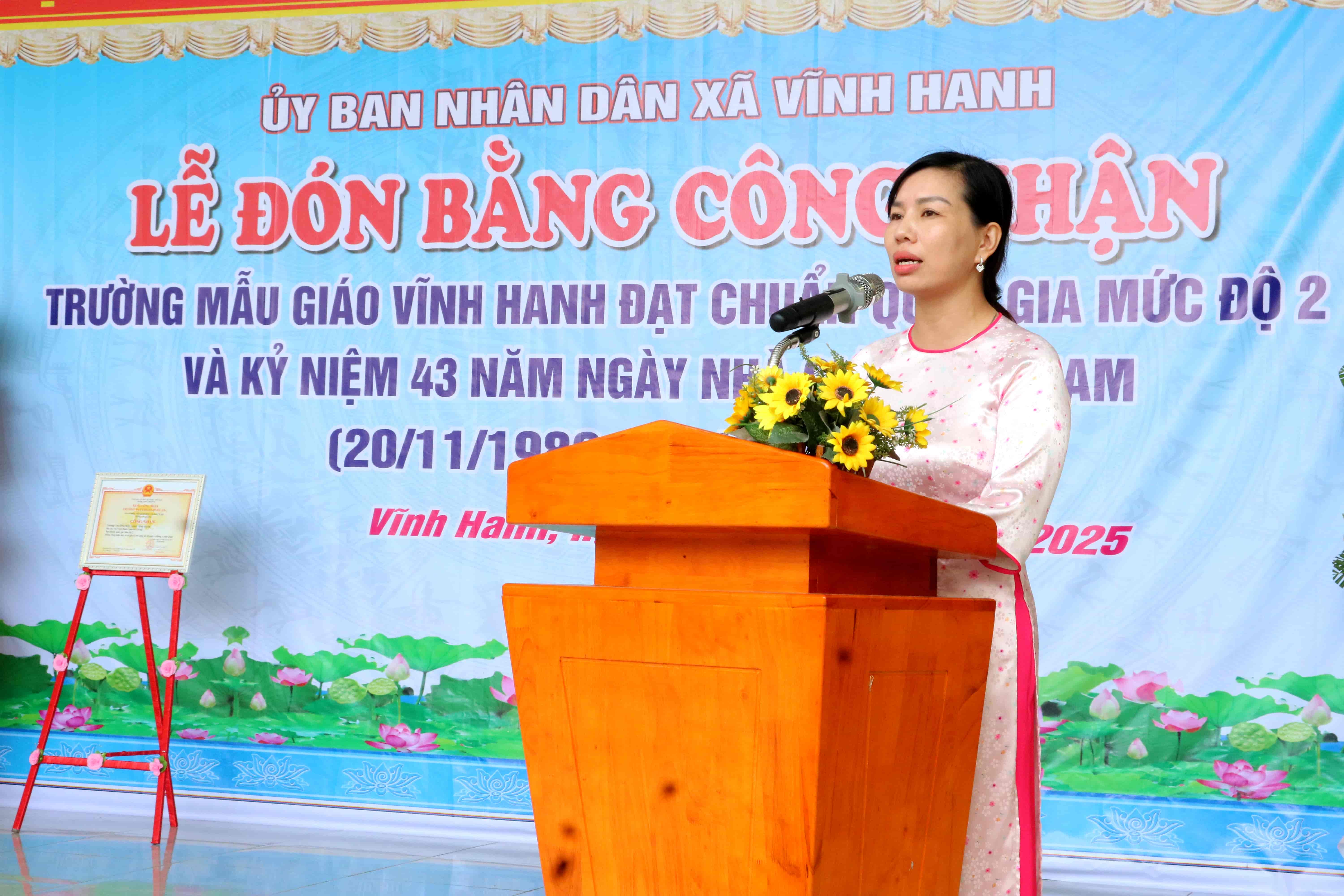 Đồng chí Tạ Thị Xuân – Hiệu trưởng Trường Mẫu giáo Vĩnh Hanh phát biểu tại Lễ đón bằng công nhận.