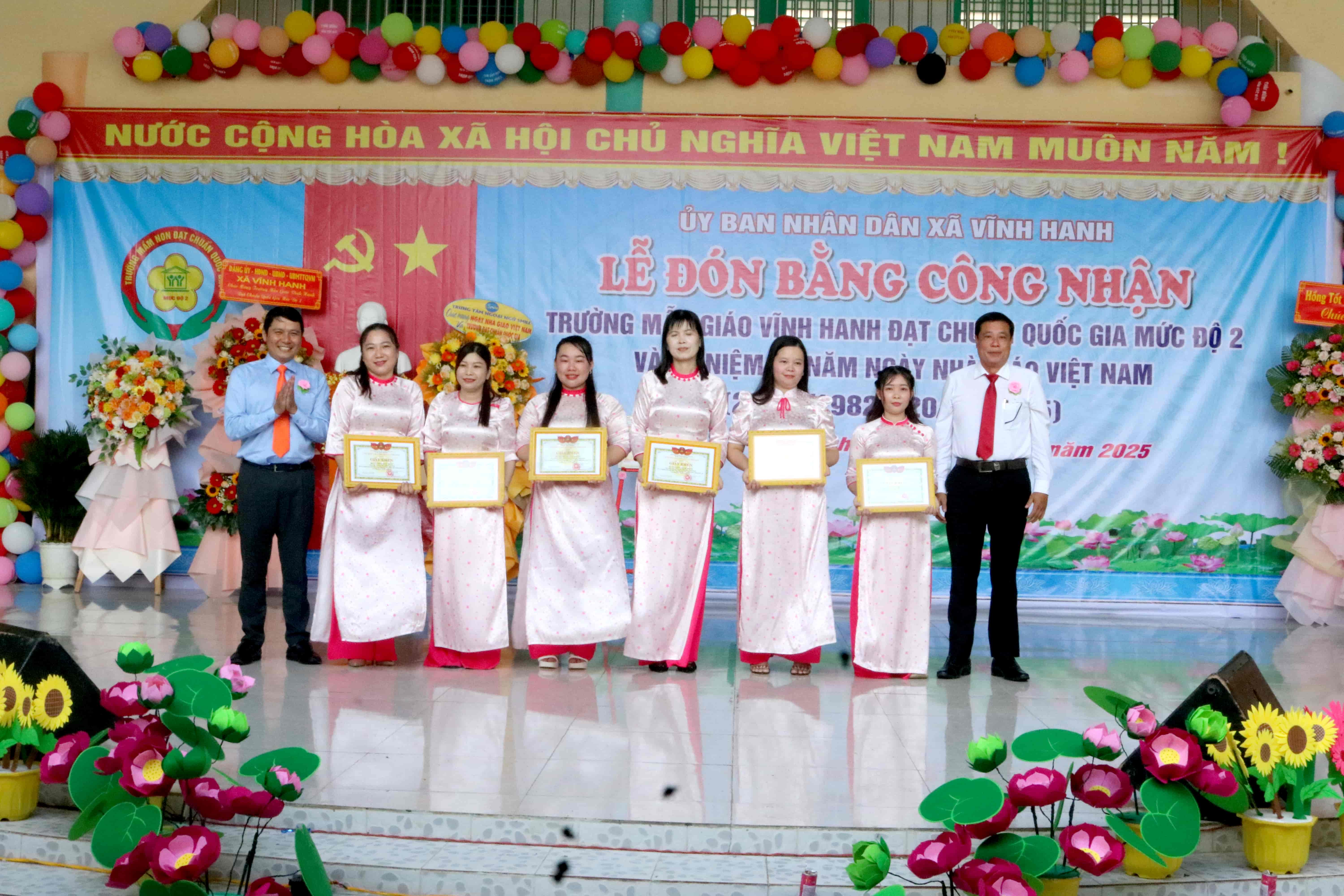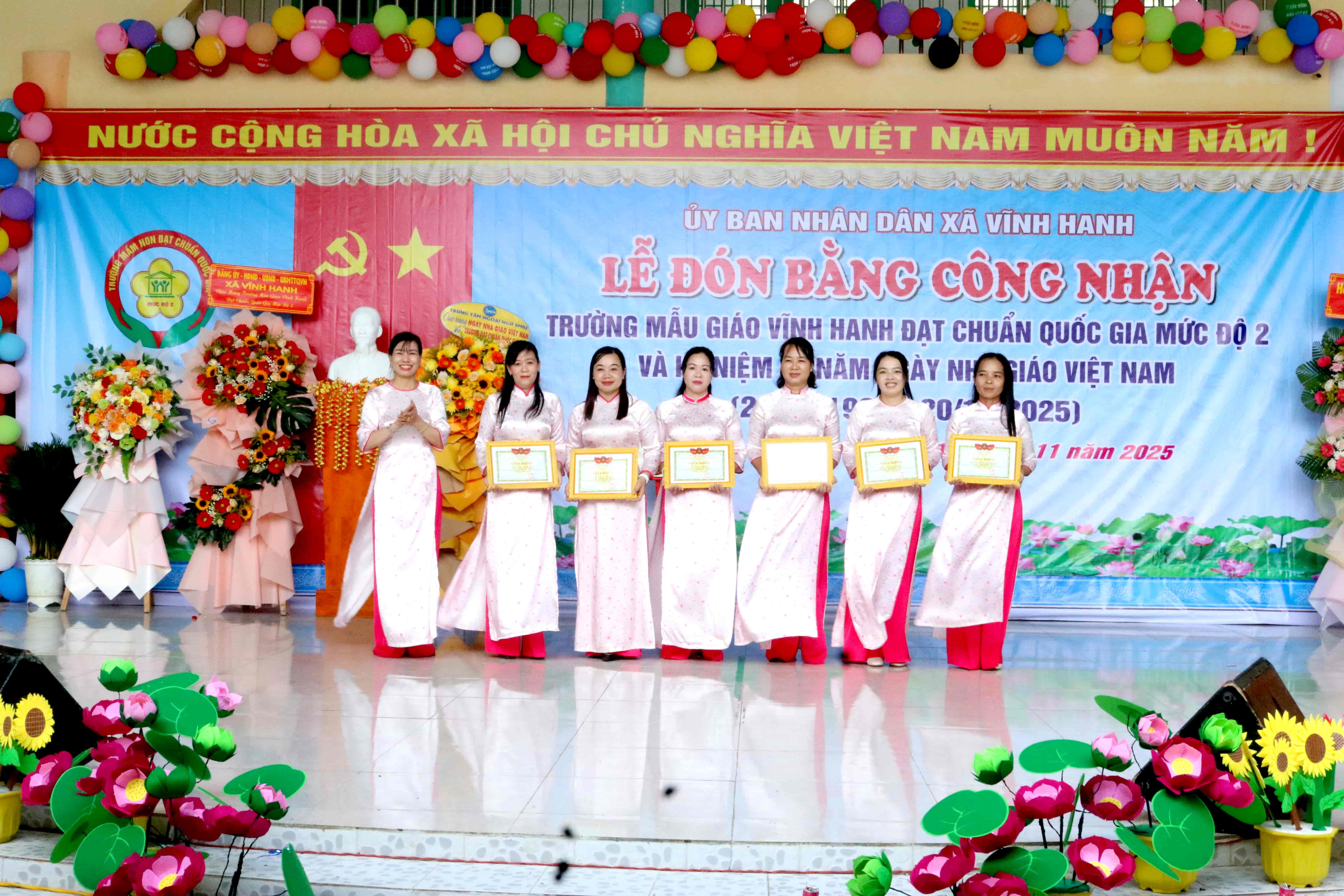 Dịp này, tập thể và giáo viên của trường được khen thưởng vì có nhiều đóng góp trong xây dựng Trường Mẫu giáo Vĩnh Hanh đạt chuẩn quốc gia mức độ 2.