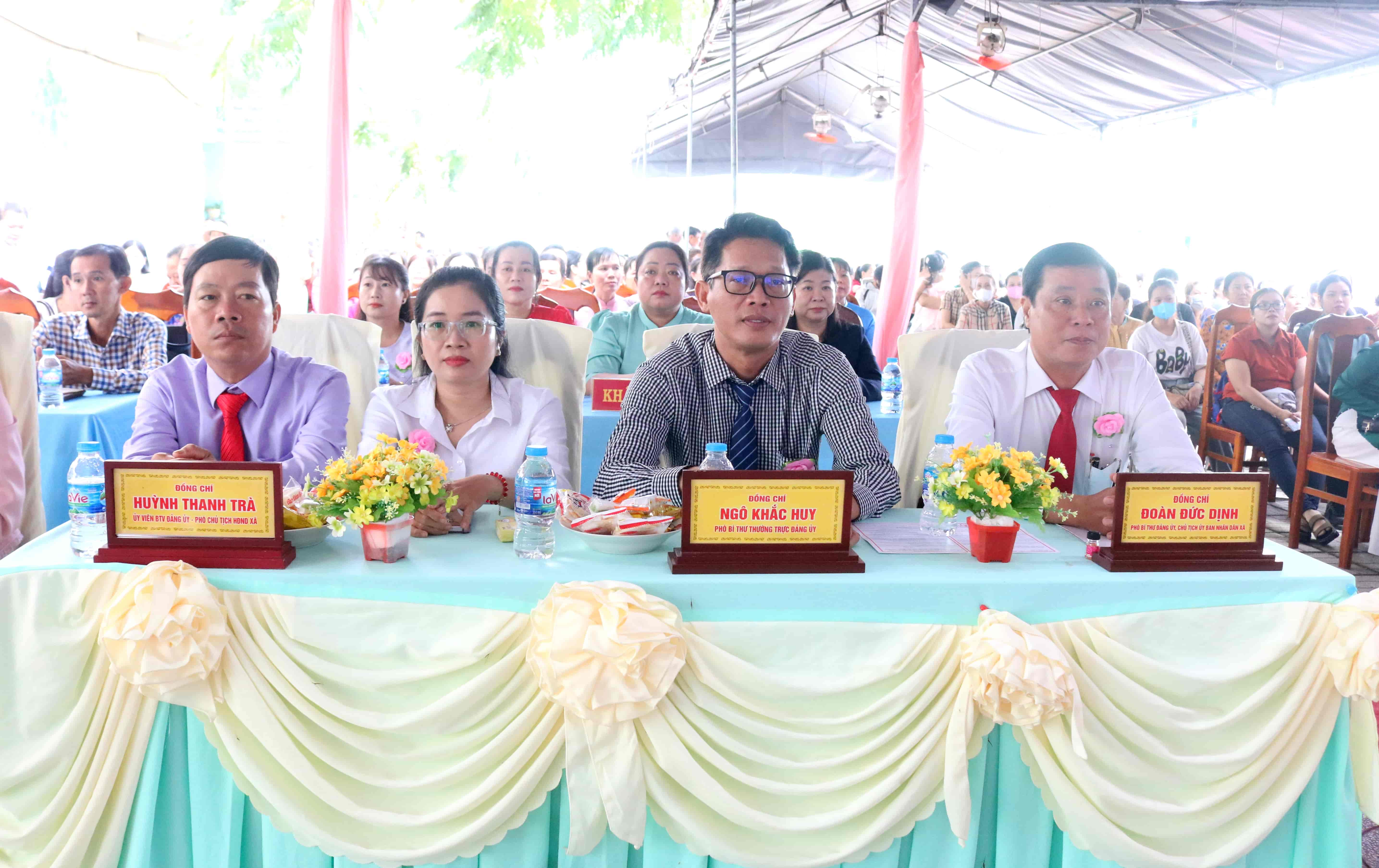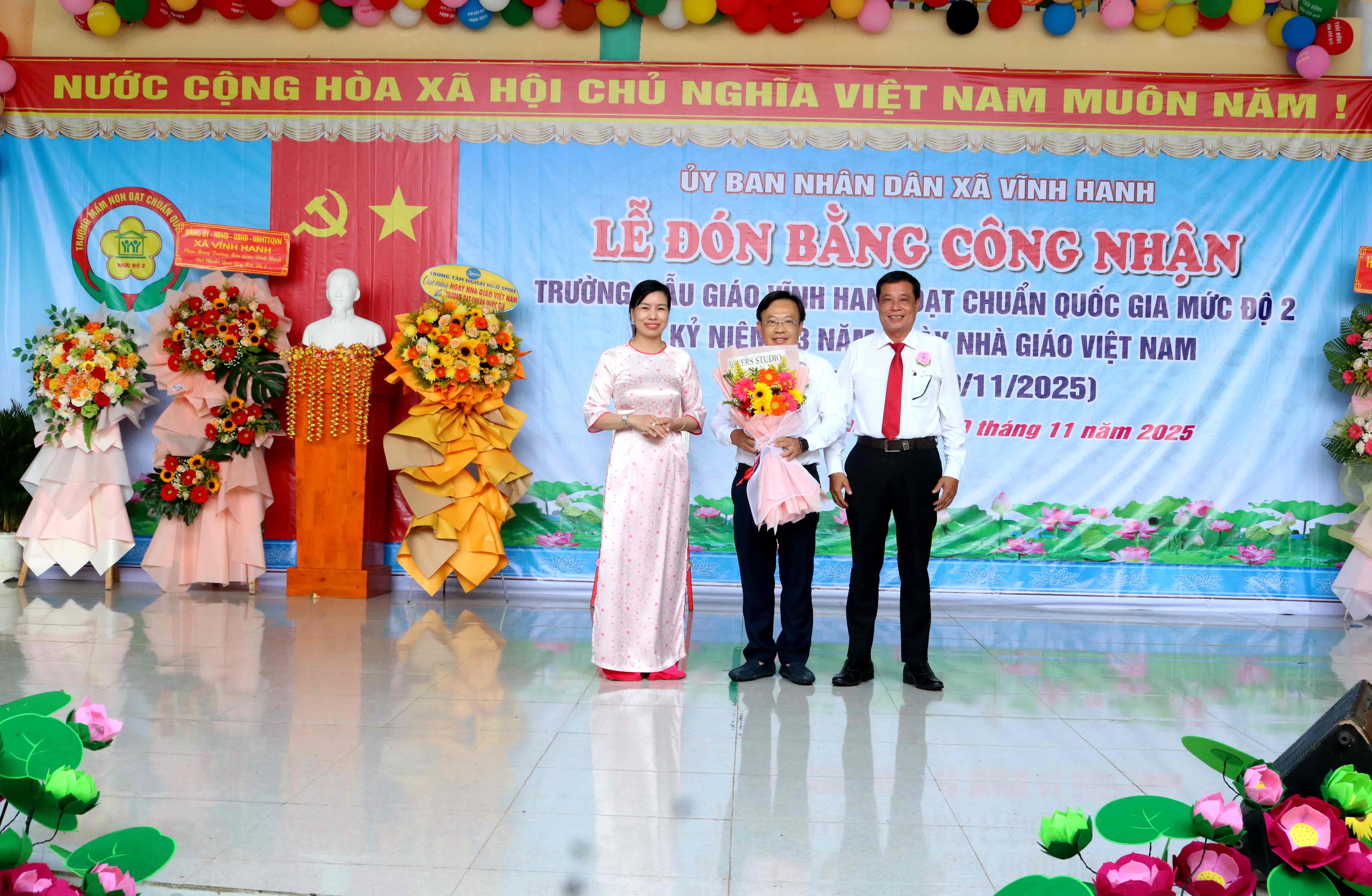 Lãnh đạo xã Vĩnh Hanh và hiệu trưởng Trường Mẫu giáo Vĩnh Hanh trao tặng hoa đến đồng chí Trần Tuấn Khanh – Phó Giám đốc Sở Giáo dục và Đào tạo tỉnh An Giang.