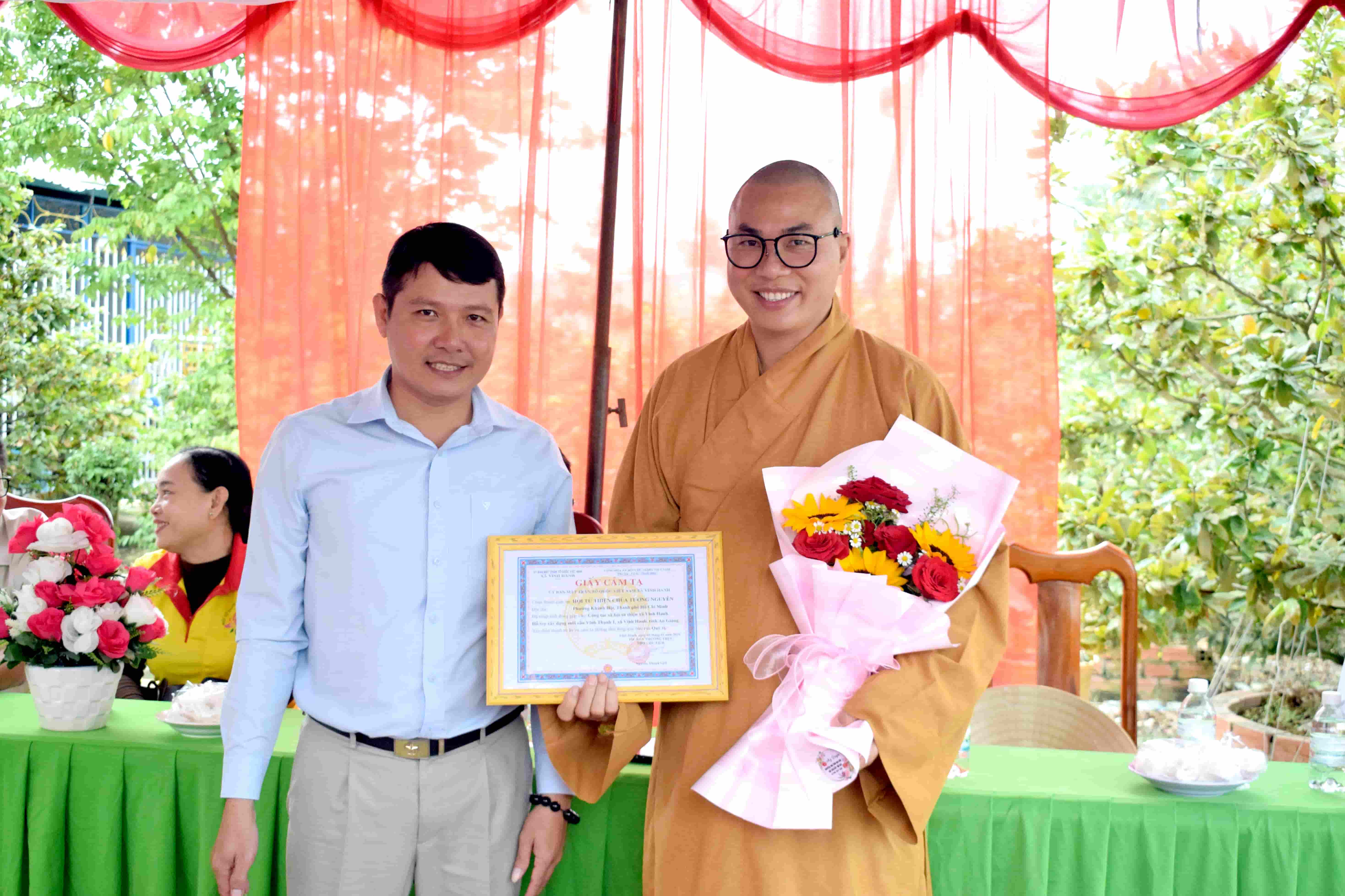 Ông Hồ Trường Huấn – Bí thư Đảng ủy, Chủ tịch HĐND xã Vĩnh Hanh trao giấy cảm tạ và đóa hoa tươi thắm thay cho lời tri ân chân thành nhất đến Thượng tọa Thích Minh Phú.